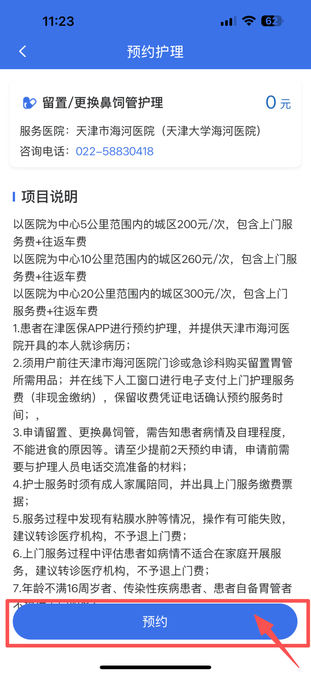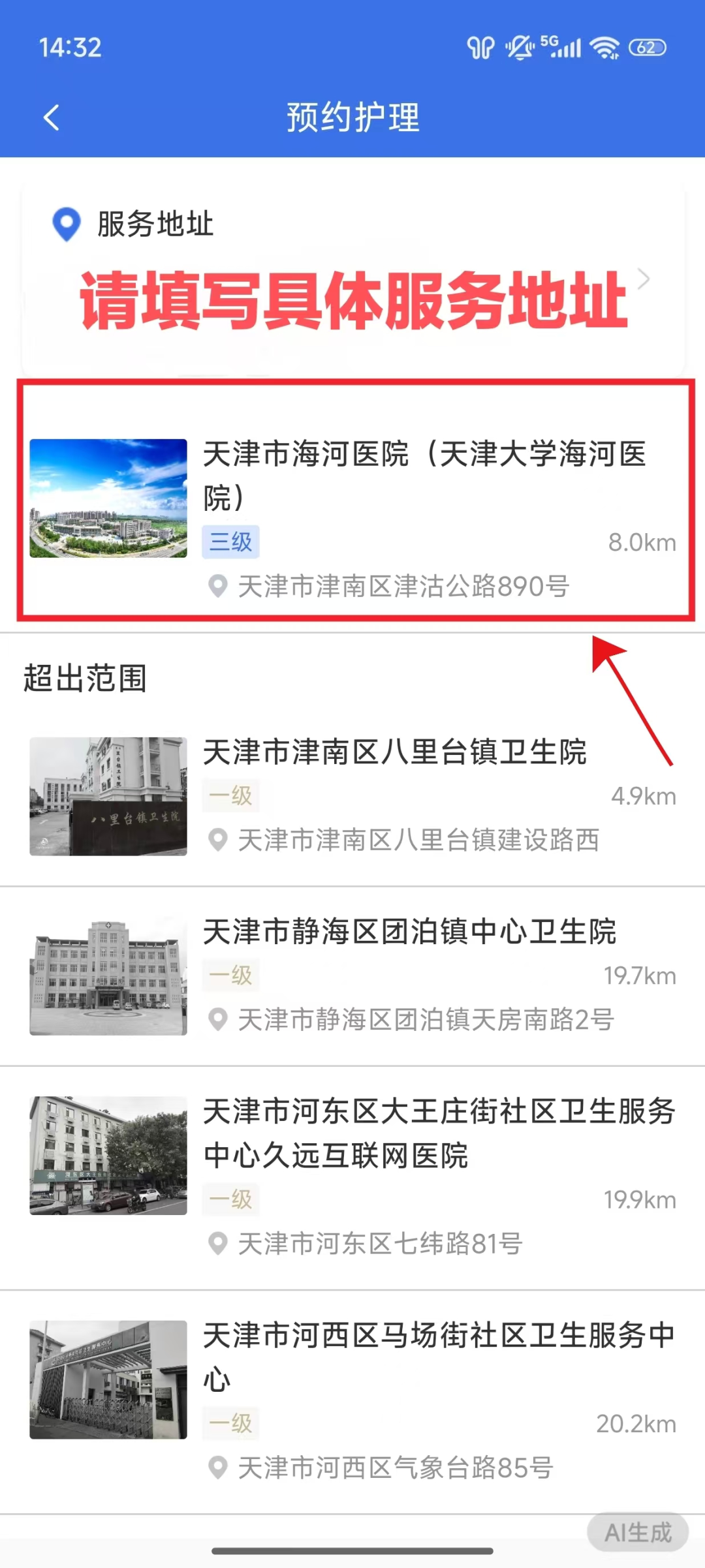注:服务范围以天津市海河医院为中心,覆盖周边20公里范围内的城区,具体以平台显示为准