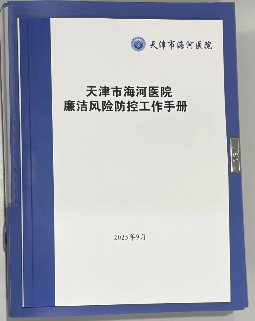 目前《天津市海河医院廉洁风险防控工作手册》已印刷成册,发放至各责任科室。随着防控手册的全面落地,监督效能已转化为可见的治理成果,其修订过程成为全员参与的警示教育实践,全体重点岗位人员在岗位自查中完成了一次“沉浸式廉洁体检”,编印成册的防控手册转型为“行走的纪律课堂”。