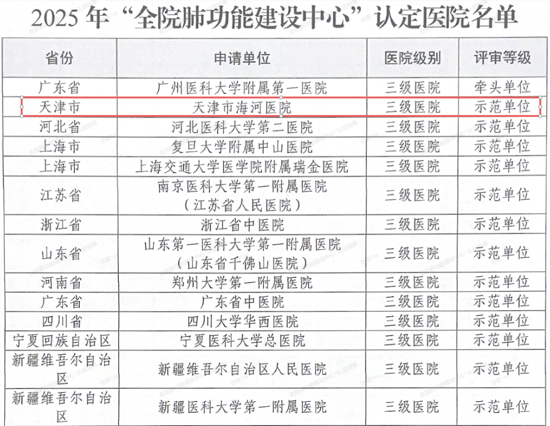 为响应国家健康中国战略,推动肺功能检查普及,提升呼吸系统疾病防治水平,由国家呼吸系统疾病临床医学研究中心、中国肺功能联盟及牵头单位广州医科大学附属第一医院组织的2025年度“优化肺功能检查多学科临床路径与管理模式全院肺功能建设中心”(以下简称“全院肺功能建设中心”)认定工作已顺利完成。经过严格、规范的评审程序,天津市海河医院被认定为2025全院肺功能建设中心示范单位。标志着我院呼吸系统疾病防治水平迈上新台阶。