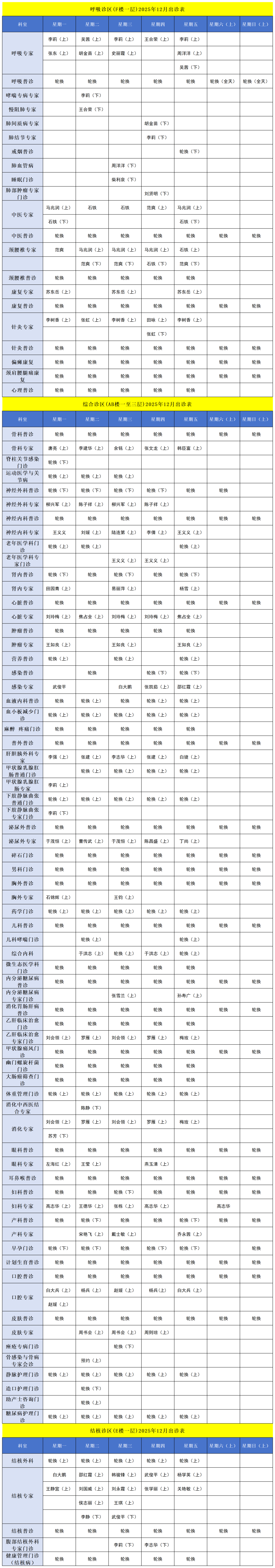 本表内容若有变动,以当日各科医师排班表及各门诊公告为准。