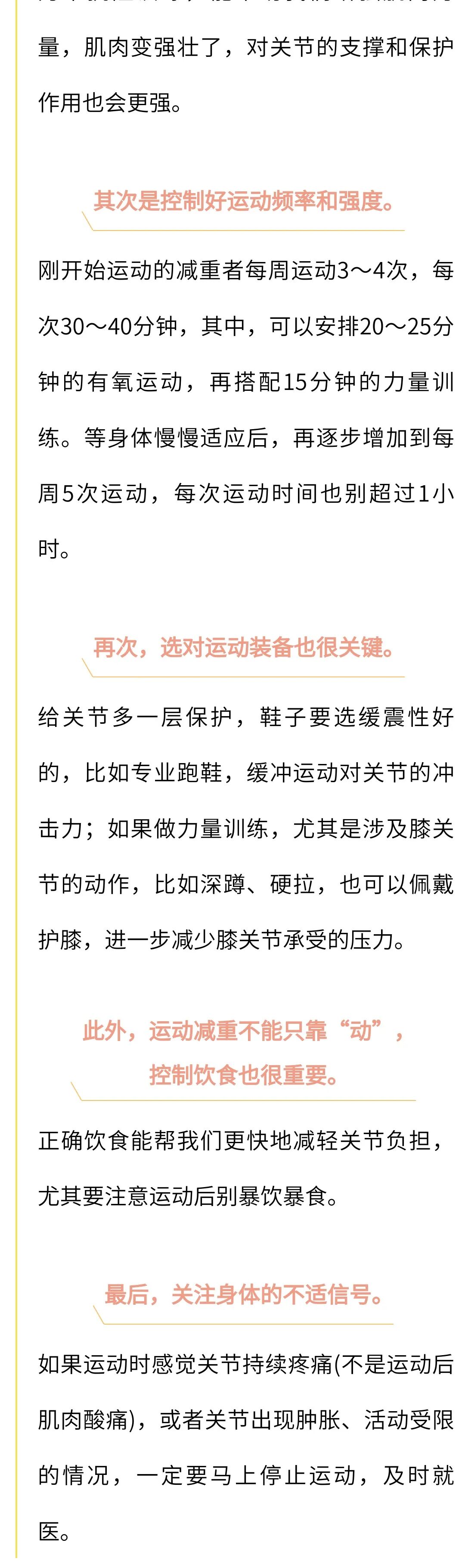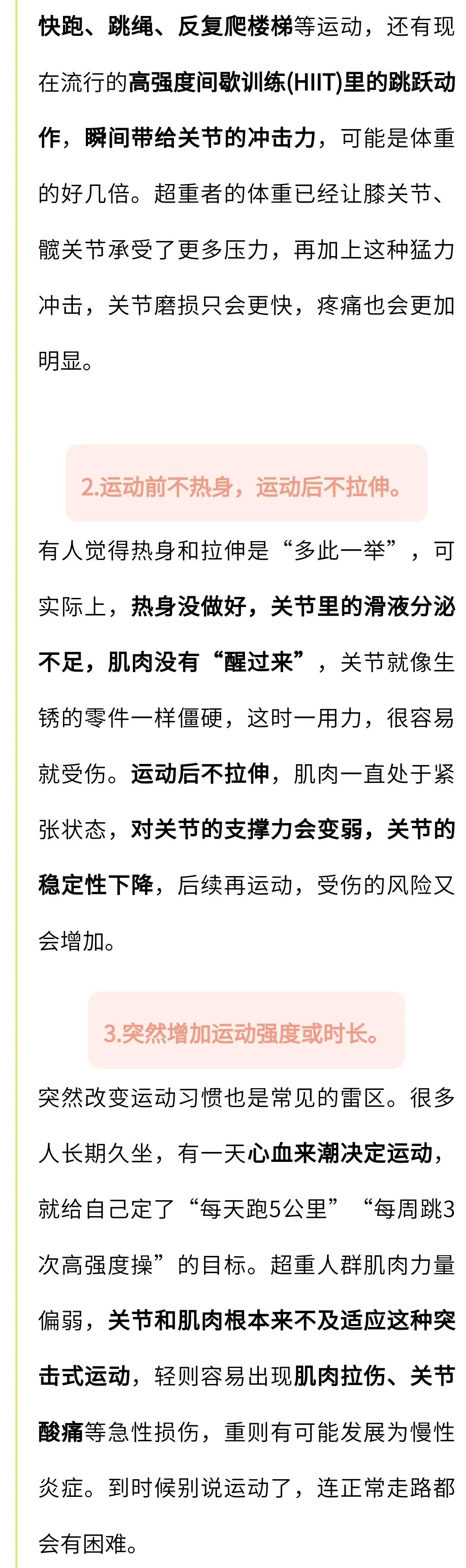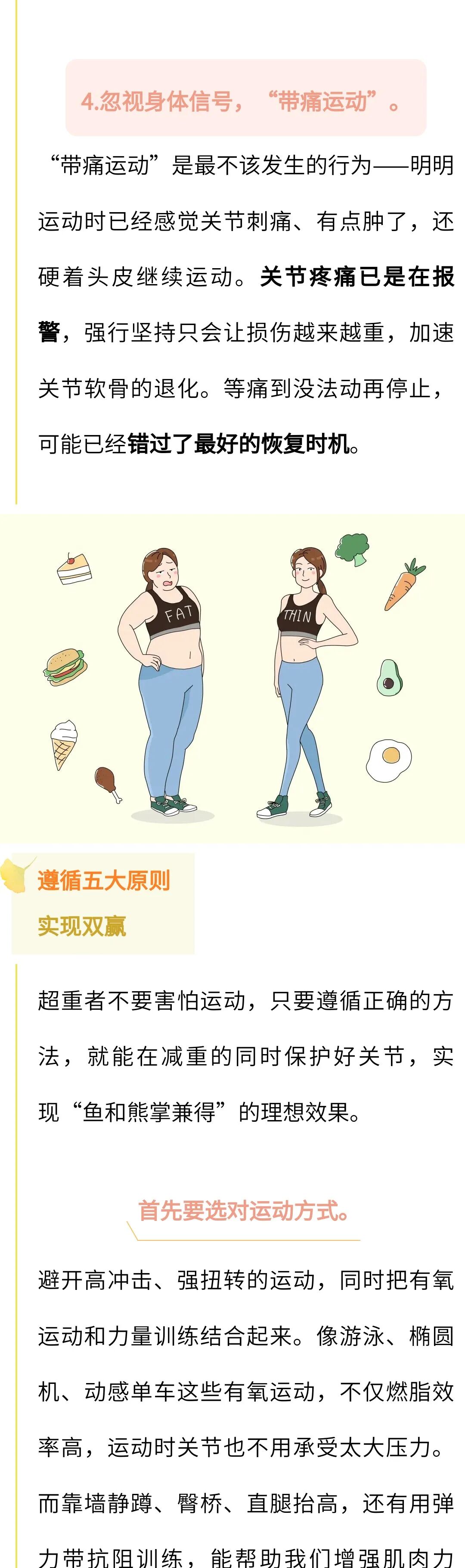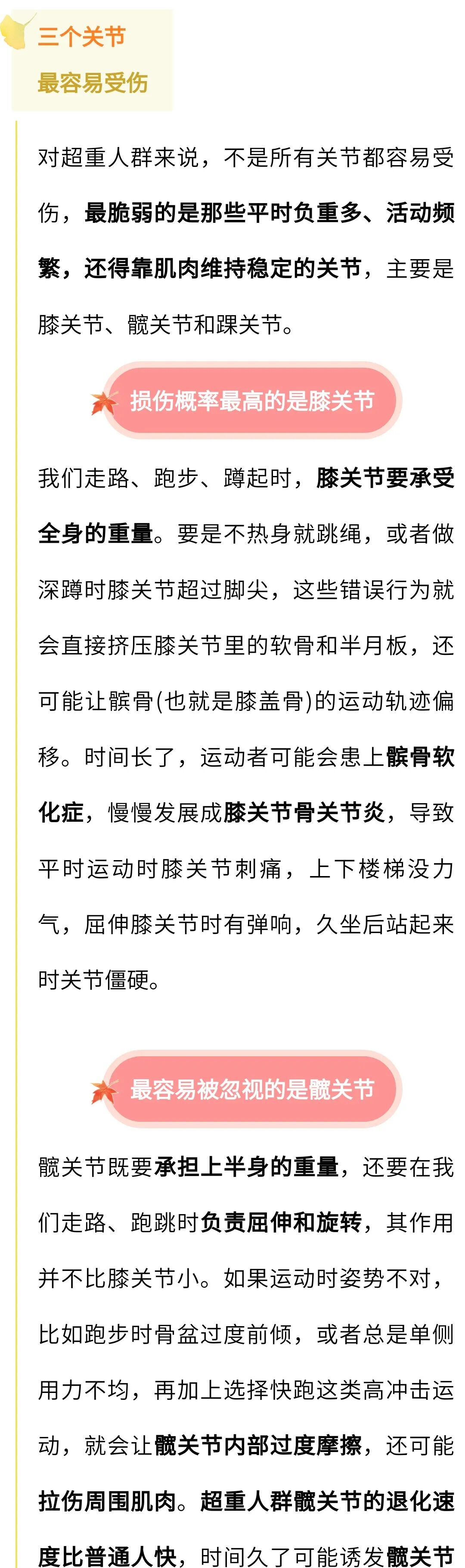 对体重超标人群而言,运动若用力过猛或方法不对,不仅难以达到减重目的,还可能让本就负荷过载的关节“雪上加霜”,增加关节损伤与关节炎的发生风险。